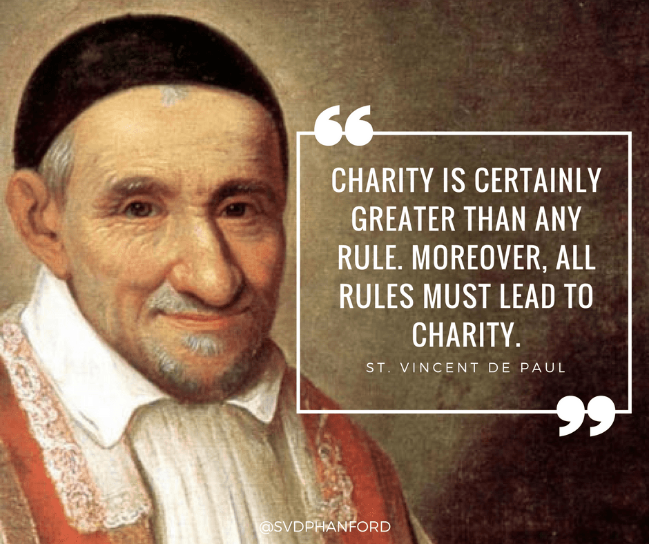 Señor Jesus,Que el ejemplo de San Vicente de Paúl nos inspire a ser generosos de corazón y manos para los necesitados. Que nuestra generosidad fluya desde la humilde gratitud por sus muchos regalos hacia nosotros en lugar de un falso orgullo hacia nuestras propias habilidades. Todos somos necesitados a nuestra manera, y por eso dependemos de su generosidad y la de los demás. Ayúdenos a responder voluntariamente al llamado del Evangelio al amor que se da a sí mismo, a buscar formas de servir en lugar de esperar que se nos sirva. Amén.